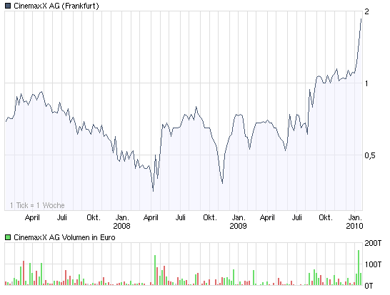 Ich dachte auch, dass eine Aktie nicht "nur" steigen kann bei der Balda AG. Hatte zu 28 Cent gekauft damals, und bin dann bei 1,3 raus...Heute stehen wir bei 4 €.... Hier liegt doch ein glas klarer Turn-Around vor. Die müssen in 2009 sehr gute positive ergebnisse haben, da im ersten halbjahr beriets 1 Mio. € verdient wurde, vor dem UFA Vergleich. Rechne mit mindestens 3 Mio. € im zweiten halbjahr, da dort 9 der TOP 10 Filme abgespielt wurden, und alle Kinos 3D hatten bis auf eines. Und die Christmas geschichte von Disney und Avatar sind rappel voll. Es wurden extrem viele Kinos abgegeben, dadurch sollte die Kette auch nachhaltig profitabel sein. Und die Aussichten in 2010 stimmen auch. Hinzu kommt, dass Kloiber kauft wie wild. Ich schliesse auch eine Dividende nicht aus, bei Cinemedia gibt es auch schon lange eine. Und das ist auch eine Kloiber-Bude. Bei 200 Mio. € Umsatz und einem EBITDA von 25 Mio. € sollte man mindestens 2,5 € sehen. Googelt einfach mal "Cinemaxx" und geht auf News. Da liest man nur von Rekorden, bei jedem lokalen Cinemaxx... |