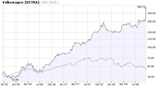 DJ: Porsche kauft am Markt keine VW-Aktien STUTTGART (Dow Jones)--Der rasante Anstieg der Volkswagen-Aktie am Donnerstag ist nicht durch Zukäufe des Großaktionärs Porsche Automobil Holding SE begründet. "Wir sind nicht am Markt aktiv", sagte ein Sprecher des Stuttgarter Sportwagenbauers am Donnerstag auf Anfrage von Dow Jones Newswires. Die Aktie des Wolfsburger Automobilherstellers war zuvor um bis zu 19% auf ein neues Allzeithoch geschossen.