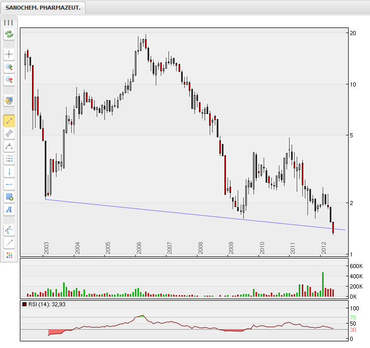 Wie man an dem angefügten Chart erkennen ist, befindet sich Sanochemia in einer charttechnisch entscheidenden Phase. Die Trendlinie (um 1,40) sollte tunlichst bald wieder zurückerobert werden ..