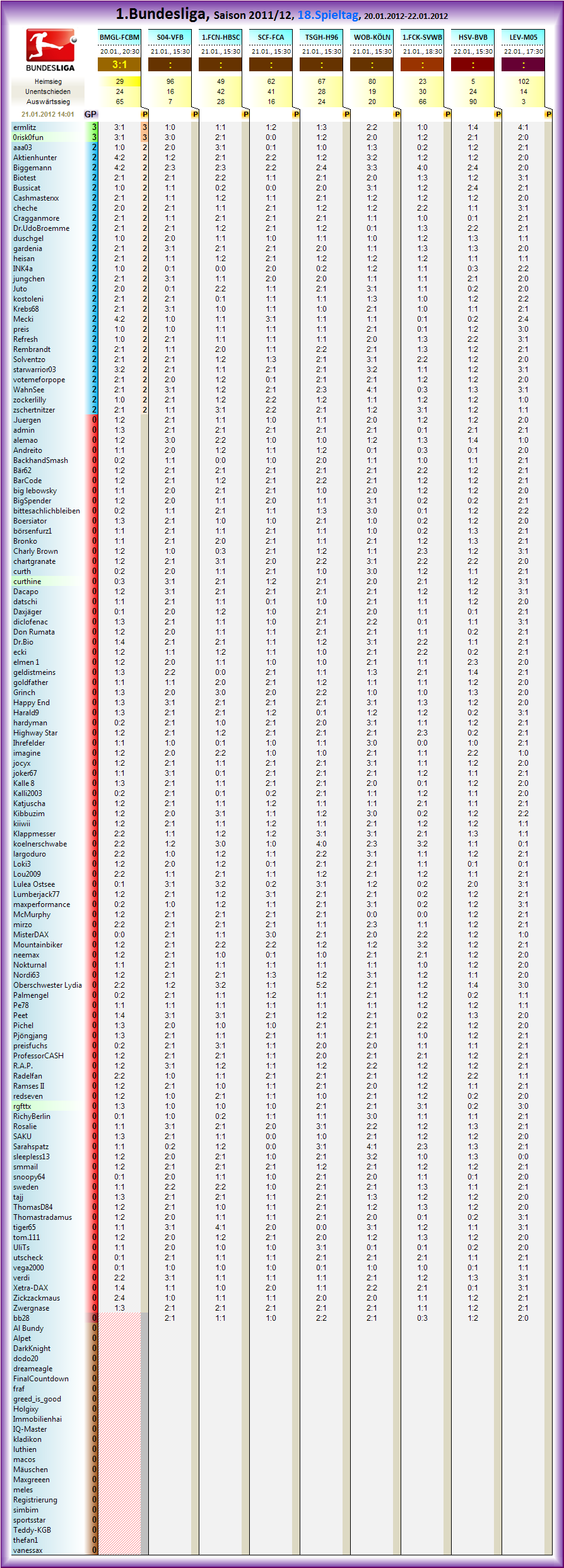 Da braucht es fast keine Kulanz.. Kann man so einfließen lassen.. Sehe das zwar schon so als Art "Ausnahmeregelung", aber in Anbetracht des Neueinstieges seh ich da kein Problem.. Was anderes wäre es wenn x sagt ich habe gestern das Ergebnis dort so gepostet und hier so, ich nehm das von da und nicht dies usw.. Also geht´s nur beim Neueinstieg als "Schlupfloch" sozusagen, aber eben regelkonform, da Tipp weit vor Spielbeginn.. und hier auf ARIVA.. denn ich sammel ja aus diesem Tippthread und HE´s Thread die Tipps und füge es zusammen.. Keine Ausnahme wird gemacht, wenn x bei bratwurst.com tippt und das hier werten möchte.. nur hier und bei HE werden Tipps gewertet oder eben aus "Nebenthread" (gab es zu Beginn der Saison ja schon mal, als es bisserl zwischen mir & HE Streit gab) Einzigstes "No" wäre, wenn die Tippgemeinschaft dagegen wäre, das zu werten.. Denn WIR sitzen alle im selben Boot.. ;o) Falls darüber diskutiert werden möchte/sollte, dann natürlich im talkthread der Gruppe: http://www.ariva.de/forum/...thread-zur-1-Bundesligatippgruppe-446210