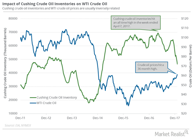 The EIA released its weekly crude oil inventories report on January 10, 2018. Cushing inventories fell by 2,395,000 barrels to 46.5 MMbbls (million barrels) between December 29, 2017, and January 5, 2018, according to the EIA. Inventories fell 4.8% week-over-week and by 20,352,000 barrels or 30% year-over-year.
