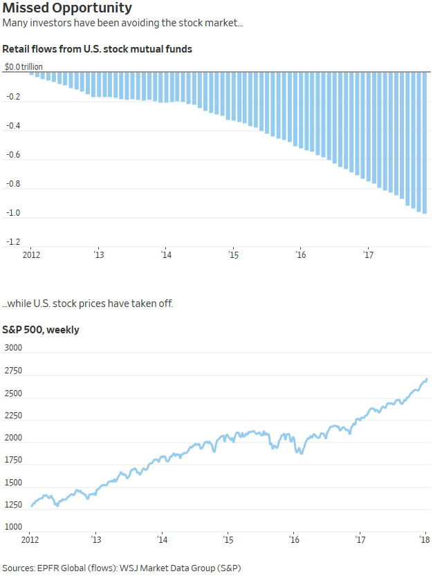Nearly $1 trillion has been pulled from retail-investor mutual funds that target U.S. stocks since the start of 2012, according to EPFR Global, a fund-tracking firm. Over that same period through Wednesday, the S&P 500 soared 116% and, along with the Dow Industrials and Nasdaq Composite Index, rose to 190 all-time highs.....
