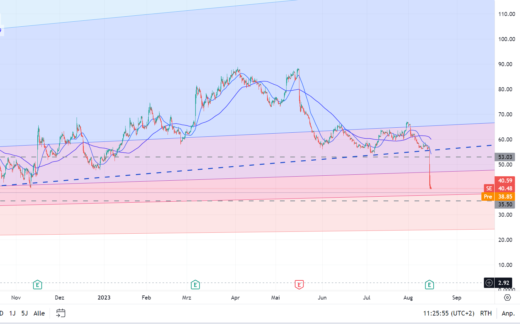 Na, da ist die Aktie heute ja abgestürzt. Aber schauen wir uns mal die Zahlen von Q2/2023 an und vergleichen: DIGITAL ENTERTAINMENT mit dem Zugpferd Garena Fire hat ein adjusted EBITDA von knapp 240 Mio. ggü. 230 Mio. aus dem Vorquartal bzw. 333 Mio. aus Vorjahres-Q2/22, das ist also ein Rückgang von 93 Mio., allerdings schneidet Q2/23 besser ab als Q1/23. In 2022 gab es von Q1/22 zu Q2/22 beim adj. EBITDA 431 Mio zu 333 Mio. noch einen Rückgang von 98 Mio. Das könnte man also so deuten, dass sich das EBITDA-Niveau in diesem Bereich bei mehr oder weniger 230-240 Mio. einpendelt. Ob das stimmt, werden uns wohl erst die nächsten 2-3 Quartale sagen. Average booking per User ist von 0,9 USD auf 0,8 USD gefallen, wird aber durch mehr aktive User ausgeglichen. E-COMMERCE adj- EBITDA nun +150 Mio., also ca. 800 Mio. besser als Q2/22, wo es -648 Mio. waren. Leider hat man sich ggü. Q1/23 mit 208 Mio. deutlich verschlechtert. Other markets (Südamerika) sind mit -54 Mio. weiterhin negativ. Hier sehe ich einen Grund, warum die Aktie so abschmiert. DIGITAL Financial Services adj. EBITDA nun +137 Mio., also ca. 250 Mio. besser als Q2/22, wo es -112 Mio. waren. Ggü. Q1/23 mit adj- EBITDA von 99 Mio. hat man sich auch um 50% gesteigert. Bei seeking alpha spricht man allerdings davon, dass wegen des geringen Wachstums in diesem Bereich die Aktie so in die Knie gegangen ist. Umsatzmäßig mag das stimmen (Q1/23 GAAP Revenue 412 Mio. ggü. Q2/23 GAAP Revenue von 428 Mio., das adj. EBITDA zeigt aber was anderes, was vllt. nicht jeder gesehen. GROUP TOTAL adj. EBITDA ist +510 Mio. ggü. -506 Mio. in Q2/22 bzw. +506 Mio. in Q1/23. Ggü. Q1/23 hat sich das adj. EBITDA total also so gut wie nicht verändert, was wohl zum Absturz geführt hat. Auf der anderen Seite stabilisiert sich das EBITDA deutlich im positiven Bereich. Sollten die nächsten beiden Quartale ähnlich laufen, hätte man bereits in 2023 ein Jahres EBITDA (adj.) von 2 Mrd. = ca. 2 USD EpS bei einem Kurs von heute 40 USD. PE (FWD) ist nun knapp über 20. Ich glaube so langsam, dass wir den Boden erreicht. Andererseits waren übrigens 0,46 EpS, nun sind es 0,54 EpS geworden in Q2/23. Verstehe einer die Börse :-) |
