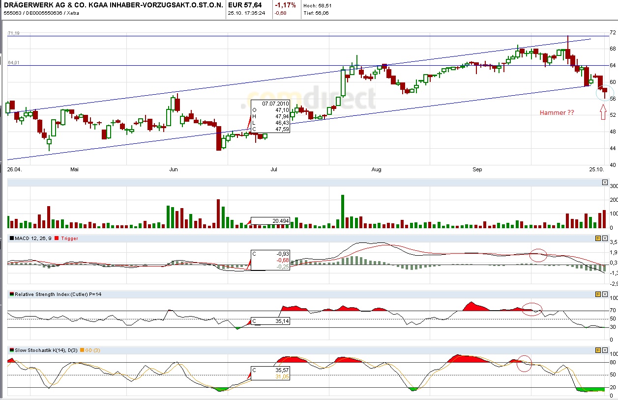 Ein Wiederstand befindet sich bei ca 71€ (resultiert aus dem Juli und Oktober 2007, wurde also 2x getestet). Danach ging er für Dräger nur noch abwärts. Mit der Prognoseanhebung hatte die Aktie Intraday diesen Wiederstand wieder erreicht und es folgte der Abverkauf. Die nächste Unterstützung ist bei ca 57€. Allerding befindet sich jetzt bei 57€ auch eine langfristige Aufwärtstrendlinie seit September 2009 sowie die 100 Tage Linie. Demzufolge ist es äußerst Unwahrscheinlich, das Dräger diesen Wiederstand reißt. Denn Fundamental steht das Unternehen glänzend da und nach den Zahlen wird bis Jahresende mit Sicherheit ein neues Alzeithoch zu sehen sein.