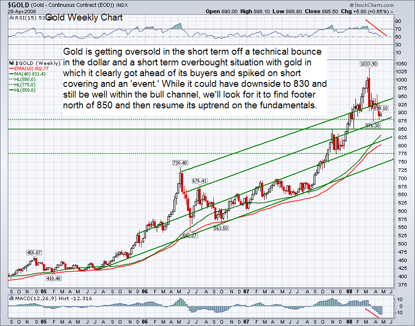 Denn letzten Endes ist die morgen zu erwartende Zinssenkung bereits längstens in jedermanns Überlegungen enthalten. Und ob es nun 25 oder 50 Basispunkte werden, ob die erste Schätzung des US-Bruttoinlandsprodukts für das 1. Quartal 2008 bei +0,7% oder –0,7% herauskommt oder ob die US-Arbeitsmarktdaten schlecht oder noch schlechter ausfallen – all das kann die Kurse nur für ein, zwei Tage deutlicher beeinflussen. Aber solange jedem klar ist, dass die grundsätzliche Gesamtlage negativ ist, können diese Tagesereignisse keine Trendwende zuwege bringen. Der Dollar hingegen könnte.