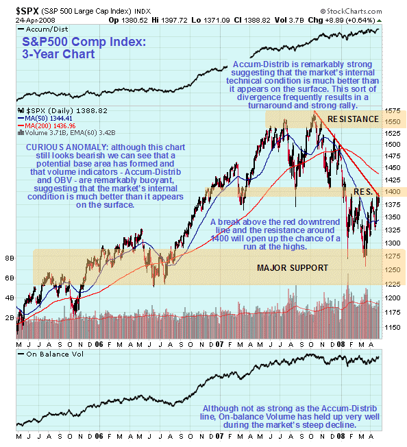 ….Now we crystallize the most important point of this article, which is what the whole thing has been leading up to. As we have already noted, the United States is widely perceived as an economic basket case on account of its astronomic debts and weakened domestic economy, but it is in the process of seizing control of the world's most important remaining oil reserves and bringing them on line. Once it has achieved this it will not just be the greatest military power on earth but will assume center stage as the greatest economic power on earth as well and be completely unassailable. By that time no other country will dare to, or perhaps even want to, dump dollars or US Treasuries. As we have observed on www.clivemaund.com in the recent past, the US stockmarket has refused to make new lows (apart from a fleeting intraday new low) for a couple of months now, despite all the doom and gloom flying around, and the volume internals of the market are bullish. So it would appear that Smart Money is beginning to get a handle on what's cooking as set out here. If our evaluation of the situation is correct, and China continues to play ball by not dumping US dollars or Treasuries, despite the Tibet provocation in the western media, then the US stockmarket is poised for a powerful bull market advance, as the injection of massive amounts of newly created liquidity works its magic and eases the global financial crisis. This advance would initially take the market back to its highs, but should later continue on to new highs. The huge global increases in money supply are of course highly inflationary and should continue to fuel a robust bull market in commodities, including gold and silver, even if they get put on the back burner and continue to correct for a while as the focus shifts to the broad stockmarket. Right now the US stock markets are poised to break out above the crucial 1400 resistance level on the S&P500 index, an event that could easily trigger a 400 - 500 point up day on the Dow Jones Industrials.