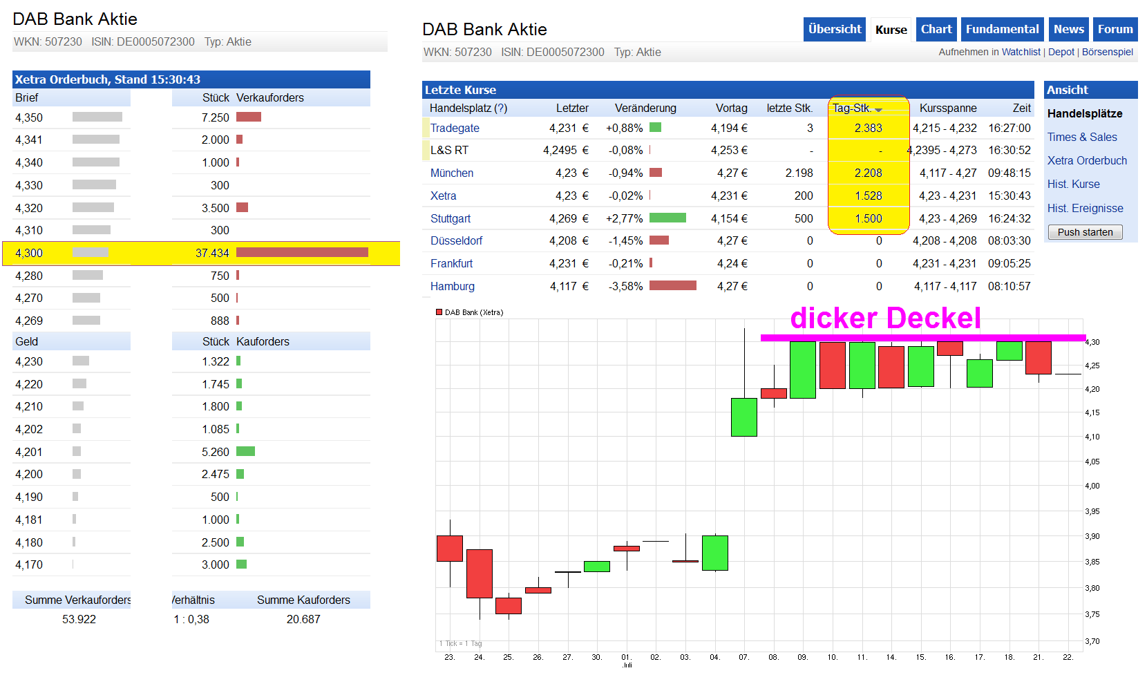 Zeit die Ernte einzufahren. War ja relativ wenig Riskio bei dem Trade, da ja absehbar war, daß die DAB im Schaufenster stand zum Verkauf :) Mit dem gebotenen Kurs von ca. 4,78 kann man eigentlich leben. Kommt ja schon relativ nahe an die angedachten 5€ ran. Mehrheitsbeteiligung: BNP Paribas kauft HVB die DAB ab http://www.handelsblatt.com/unternehmen/banken/...print/10277808.html Erst vermeldet BNP Paribas einen Milliardenverlust, dann den Kauf der DAB Bank: Mit dem bisherigen Mehrheitseigner HVB sind sich die Franzosen handelseinig geworden. Stimmen die Behörden zu, werden 354 Millionen fällig. Die DAB Bank dürfte in Kürze einen neuen Mehrheitseigner finden. Wie am Abend aus einer Pflichtmitteilung des Münchener Finanzinstituts hervorging, haben sich die französische Großbank BNP Paribas und der bisherige Inhaber, die Hypovereinsbank (Unicredit Bank AG), auf einen Verkauf der DAB verständigt. 81,4 Prozent der Anteile sollen, die Zustimmung von Kartellbehörden und Bafin vorausgesetzt, an die BNP gehen. AlsPreis pro Aktie stehen 4,78 Euro im Raum, was sich auf ein Gesamtvolumen von etwa 354 Millionen Euro summiert. Der DAB-Vorstand signalisierte seine Zustimmung. Wenn auch die Kartellbehörden das Vorhaben billigen, erhalten die Kleinaktionäre der DAB ein Übernahmeangebot. Insgesamt könnte der Zukauf BNP damit bis zu 435 Millionen Euro kosten.... |
