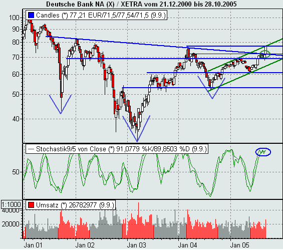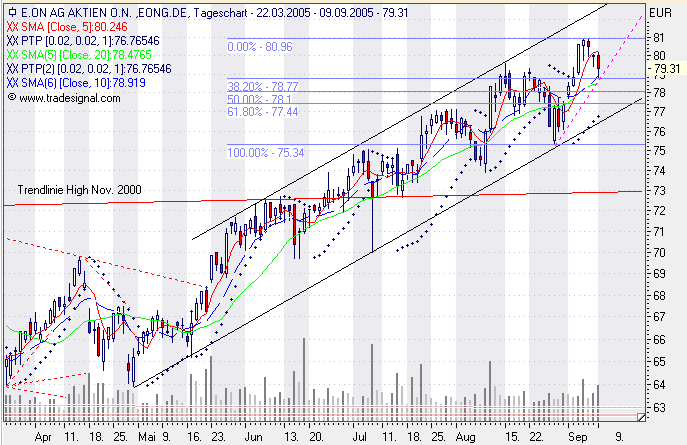 Entweder Annäherung an die untere Trendkanalbegrenzung oder Ausbildung eines zweiten Impulses nach oben, dann sollte das 50er RT bei 78 aber nicht mehr deutlich unterboten werden.