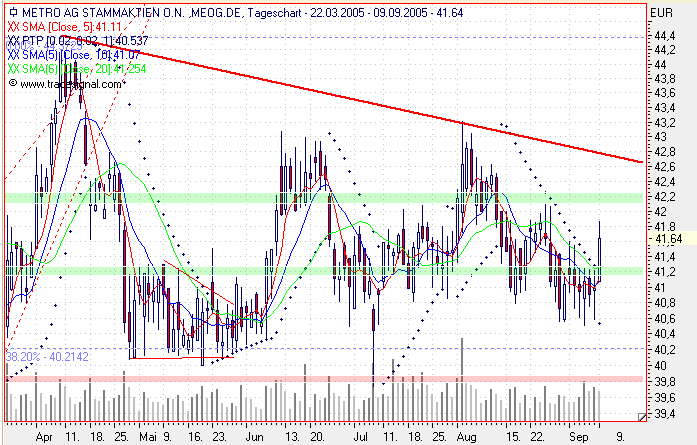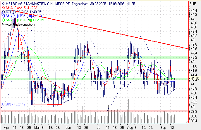Bei Bruch der roten Downtrendlinie könnte ein long Versuch lukrativ sein. Im Bereich 39,8-40,2 scheint die Metro gut unterstützt.