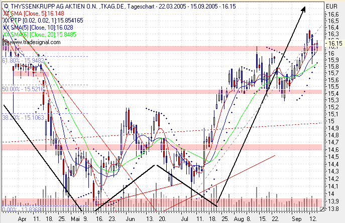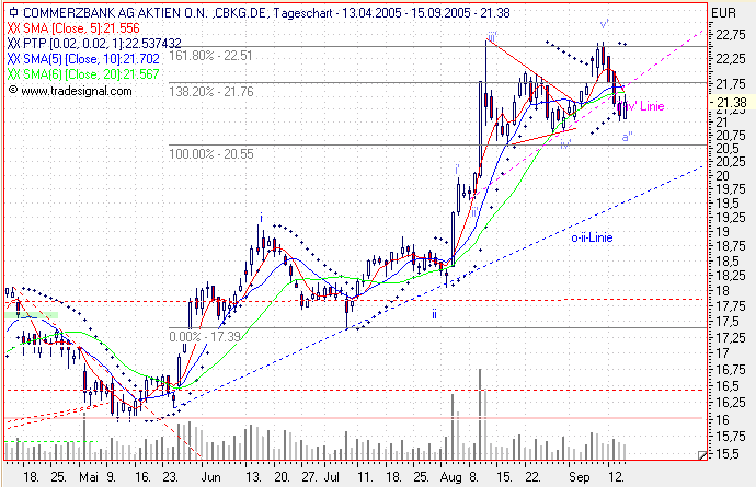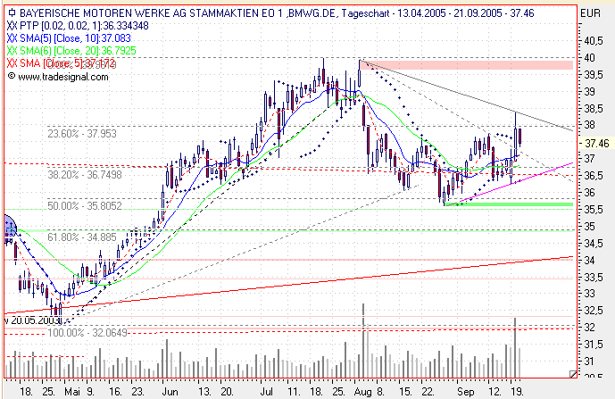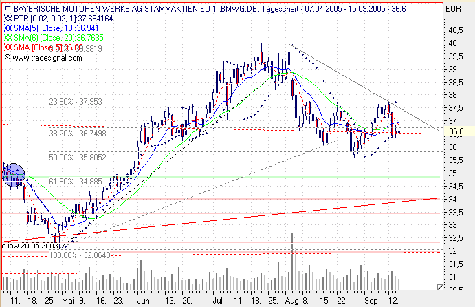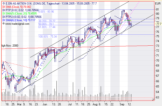 DPW: Im daily kann man einen Trendkanal einzeichnen ausgehend vom Mai low, dessen untere Begrenzung gerade getestet wird. Das 50er RT seit dem high im August wurde bereits erreicht und leicht unterboten. Allerdings ist dieser Trendkanal bei nur zwei Berührungspunkten als Konstruktion fragwürdig und kann nur als Breaklevel dienen. Die eigentliche Trendlinie ausgehend vom low 10.10.2002 verläuft derzeit bei ca. 18 und stellt die eigentlich relevante Marke für den übergeordneten Trend dar. Der MACD mit Kreuzung von unten nach oben.