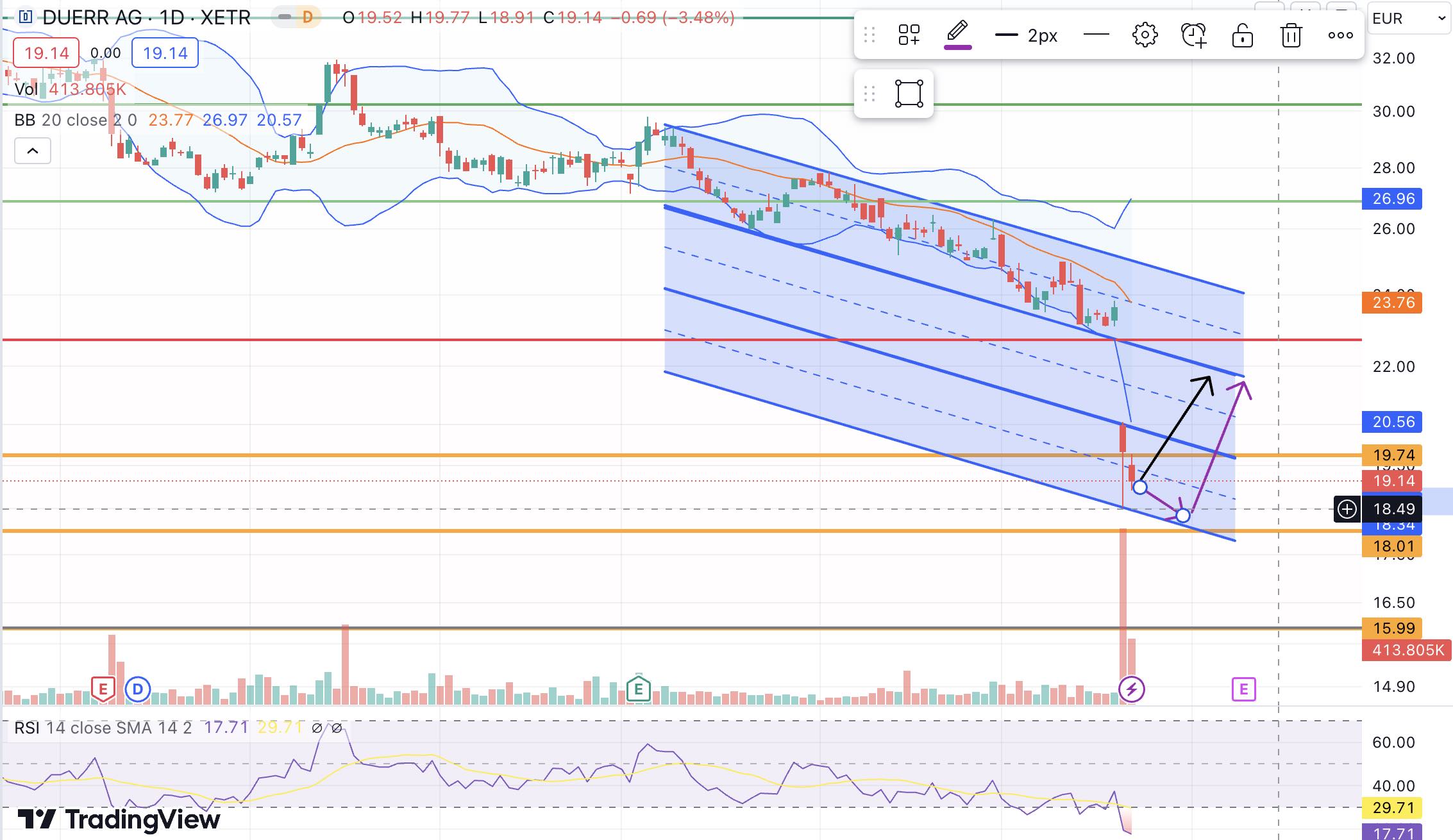 Dürr hat ein schönes iBnR Pattern ausgebildet, wir sind in der Bump Phase, aktuell mit zwei Kanalbreiten hat der Bump sein statistisches Werk getan, ein weiterer Rutsch ist deswegen nicht ausgeschlossen, aber der RSI legt es nicht nahe. Achtung, bis der Run, Mindestziel untere Kanallinie des Ausbruchskanals, Idealziel obere, zurückläuft, kann es dauern und der Kurs kann auch gerne noch unten an dem aktuellen Kanal wochenlang langlaufen (und damit ausgehend von diesem Fallen). CT ist ja ab und an ästhetisch, daher wäre nicht auszuschließen, dass der Schnittpunkt bei 18 Euro in Zeit und Raum ein Zielpunkt ist. Das wäre um den 02.11., also kurz vor den Zahlen. Ein weitere wichtiger Widerstand ist bei 15.99, das wäre im übrigen ziemlich gut eine weitere Kanalbreite, ein Kann, kein Muss. Das ist ein Brett, einstellig, wie oben wer meinte, ist nach CT erst mal nicht absehbar (immer daran denken, dass ist graphische W-Theorie, es gibt Marken und Formationen, die dann einen weiteren Kursverlauf mit einer dokumentierten Wahrscheinlichkeit nahe legen, dass ist keine Glaskugel, sondern ein stochastischer "if then with likelihood " Walk).