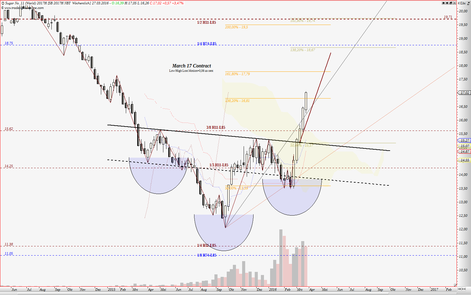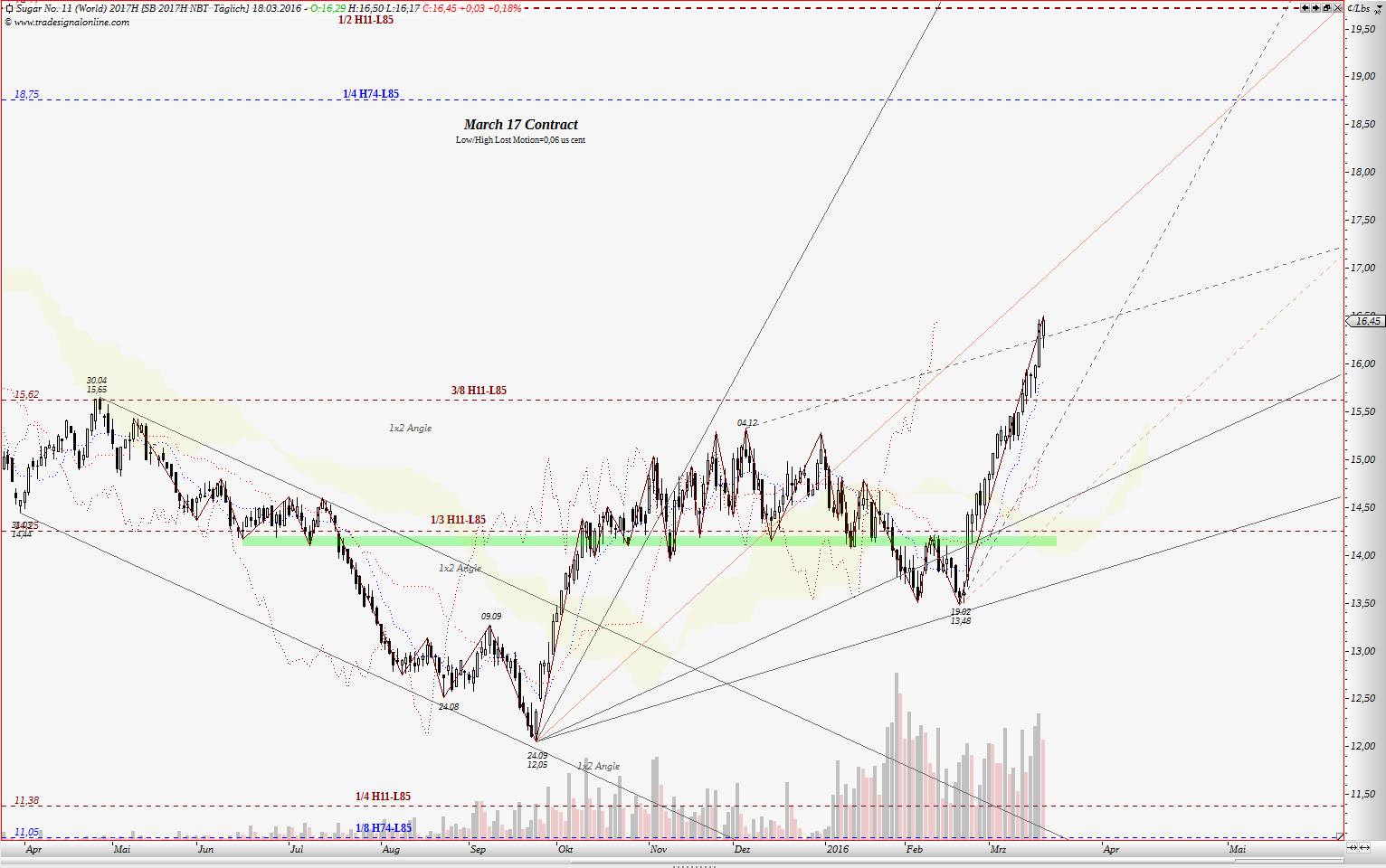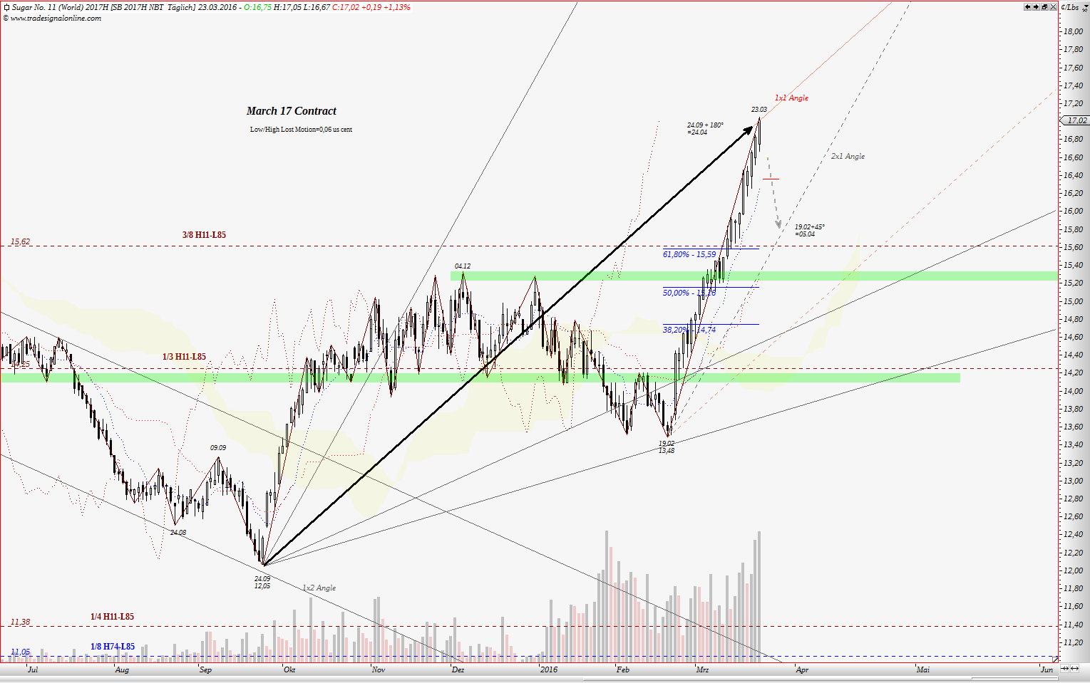 wenn jemand meine frühere Treads gelesen hat, kennt noch die 3/8 Gann Linie. Für März 2016 Kontrakt war das ein starker Widerstand. Dort begann die Korrektur zw. Dezember und Februar. Für März 2017 Kontrakt könnte das eine wichtige Unterstützung werden. Interessant ist, wo jetzige Korrektur begann. Am 23.03 traf Kurs auf die 1x1 Gann Winkellinie aus dem Tief 24.09.2016. Nach Master Chart 360° liegt 23.03 in 180° von 24.09.16. Also machte Zeit die Hälfte des Wegen im Kreis: Preis gliech die Zeit aus. Nehmen wir jetzt Tief von 09.02, dann ist gut zu sehen, dass Preis zu diesem Tief schneller ist als die Zeit, somit liegt es nahe dass dieser Preis anfang April ausgegliechen werden soll. In der Sprache der Chartisten: Aufwärtsbewegung, die Seit Februar läuft korregiert gerade. 61,80% Fibo liegt fast auf dem gleichen Niveau wie o.g. 3/8 Gann Linie. Somit erwarte ich diese Korrektur bis 15,60 - 15,80, maximal jedoch bis ca. 15,20.