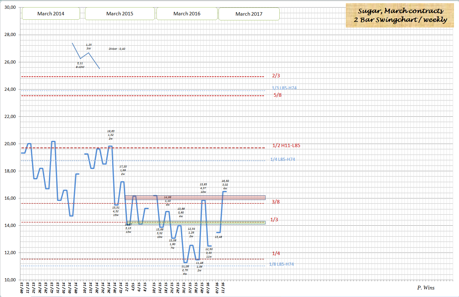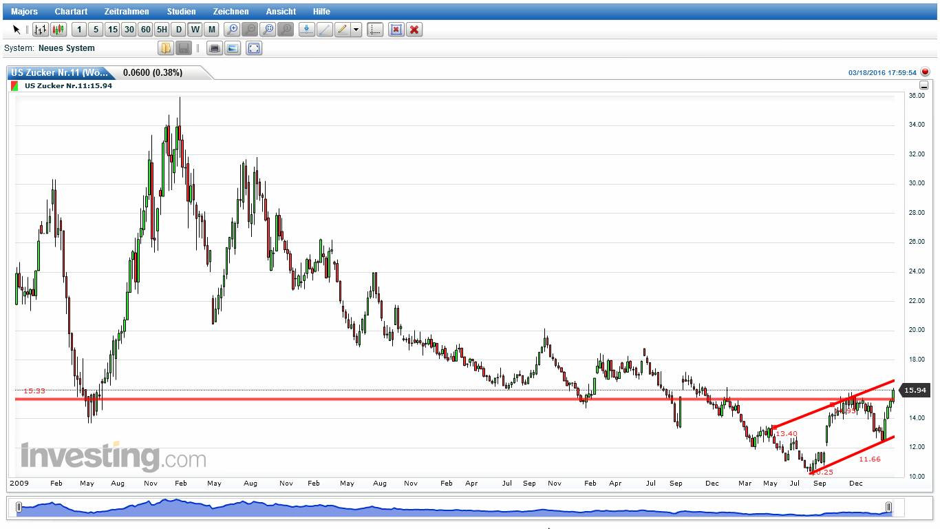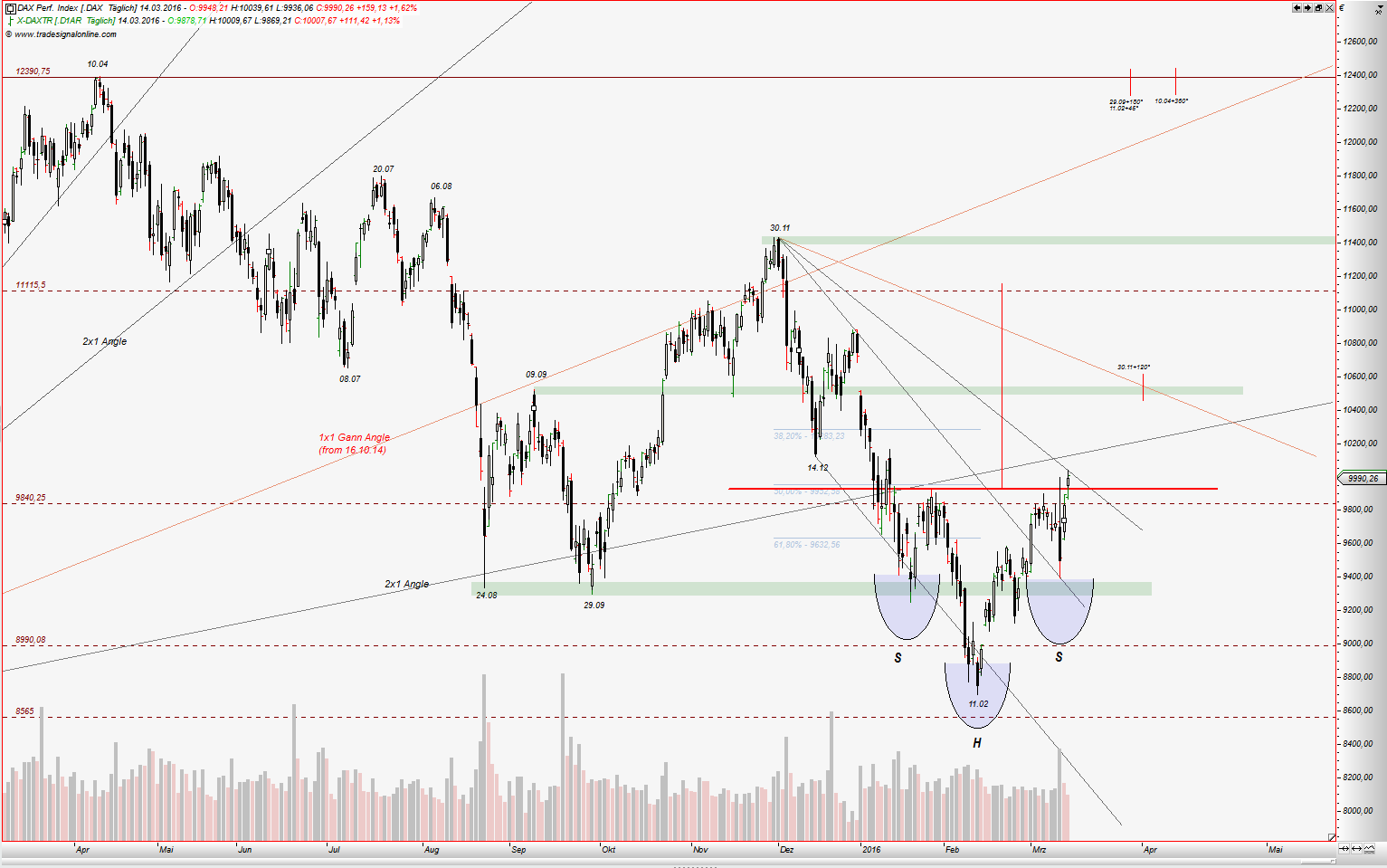wenn jemand meine frühere Treads gelesen hat, kennt noch die 3/8 Gann Linie. Für März 2016 Kontrakt war das ein starker Widerstand. Dort begann die Korrektur zw. Dezember und Februar. Für März 2017 Kontrakt könnte das eine wichtige Unterstützung werden. Interessant ist, wo jetzige Korrektur begann. Am 23.03 traf Kurs auf die 1x1 Gann Winkellinie aus dem Tief 24.09.2016. Nach Master Chart 360° liegt 23.03 in 180° von 24.09.16. Also machte Zeit die Hälfte des Wegen im Kreis: Preis gliech die Zeit aus. Nehmen wir jetzt Tief von 09.02, dann ist gut zu sehen, dass Preis zu diesem Tief schneller ist als die Zeit, somit liegt es nahe dass dieser Preis anfang April ausgegliechen werden soll. In der Sprache der Chartisten: Aufwärtsbewegung, die Seit Februar läuft korregiert gerade. 61,80% Fibo liegt fast auf dem gleichen Niveau wie o.g. 3/8 Gann Linie. Somit erwarte ich diese Korrektur bis 15,60 - 15,80, maximal jedoch bis ca. 15,20.