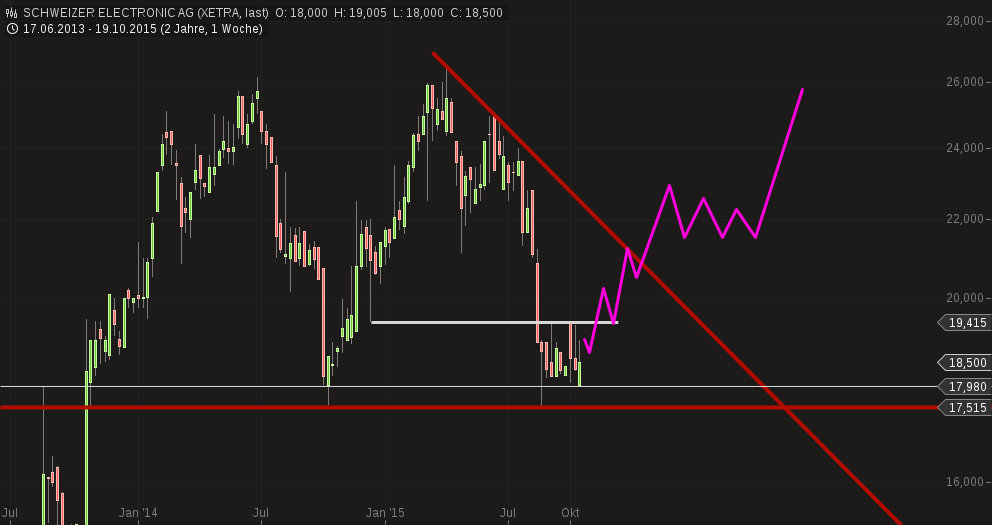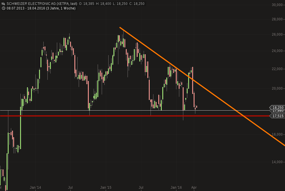 Ich kann mir gut vorstellen, dass die Aktie aufgrund dieser Tatsache zuletzt so schwach performt hat. Es scheinen sich wohl einige Marktteilnehmer nur auf das Nettoergebnis zu konzentrieren. Das sehe ich als Chance. Denn mit einem EV/EBITDA von 4,5 für 2016 ist die Aktie alles andere als teuer, auch wenn Schweizer Electronic natürlich stark zyklisch ist. Auch charttechnisch bietet sich das aktuelle Niveau zum Kauf an. Der Bereich 17,5 - 18€ ist eine dicke Unterstützungszone.