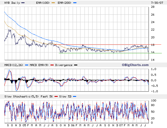 "New York Community Bancorp, Inc. is the $28.5 billion holding company for New York Community Bank and New York Commercial Bank, and the leading producer of multi-family loans for portfolio in New York City. A New York State-chartered savings bank with 137 offices serving New York City, Long Island, Westchester County, and northern New Jersey, New York Community Bank is the third largest thrift depository in the New York metropolitan region, and operates through seven local divisions", im März wurde die PennFed zugekauft (Quelle), nun im Juli noch die Doral Bank (Quelle). Im Sub-Prime-Bereich scheint sich die NYB zurückgehalten zu haben (Quelle), und der Kurs sieht bei 16$ gut abgesichert aus. Die Dividendenrendite von >6% zusammen mit der spekulation auf einen steigenden Dollar machen den Wert für mich interessant - allerdings bin ich noch nicht investiert und würde besonders der subprime-Verbindung noch etwas genauer nachgehen.