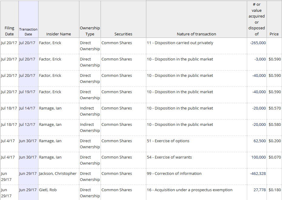Jul 20/17 Jul 19/17 Factor, Erick Direct Ownership Common Shares 10 - Disposition in the public market -40,000 $0.590