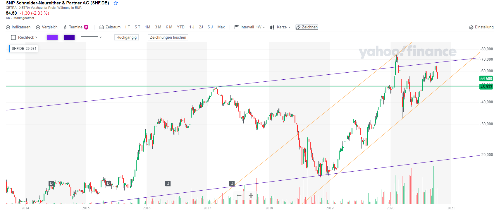 Da es in der Range selbst eine leichte Tendenz nach oben gab, denke ich wir werden bei um die 54,20 € aufschlagen und weiter seitwärts mit leichtem Anstieg laufen. Ist auch wirklich in Ordnung. Wenn wir das Jahr dann mit 62-65 € verlassen, alles gut. Selbst 57€ wäre noch ok.