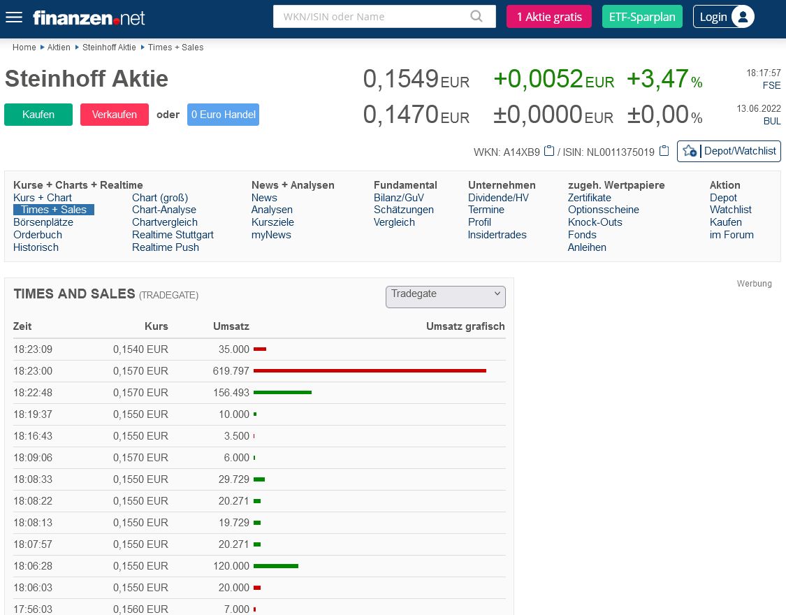 weil er an die Zukunft des Unternehmens glaubt – so bekräftigt Wulf E. Pley in seiner letzten Videobotschaft vom 27.6. auf YouTube. Und meint damit natürlich die Steinhoff-Aktie. Gleichzeitig kündigt er an, dass das sein letzter Videobeitrag zu SH gewesen sein könnte, was ich sehr bedauern würde. Denn seine Kompetenz ist nach meiner Überzeugung – und wahrscheinlich nicht nur nach meiner – unbestritten. Es wäre ein echter Verlust, wenn Herr Bley tatsächlich mit der Berichterstattung bzw. mit seinen stets plausiblen Analysen aufhören würde. Käme es dazu, könnte ich das allerdings nachvollziehen. Es muss frustierend sein, wenn trotz des stets redlichen Bemühens, SH ins rechte Licht zu rücken, auch die besten Berichte und Analysen es nicht vermögen, dem zu Unrecht desaströsen Aktienkurs auf die Sprünge zu helfen. Dem sinngemäßen Verweis von Herrn Bley auf die permanente Irrationalität des Aktienmarktes muss man nichts hinzufügen. |