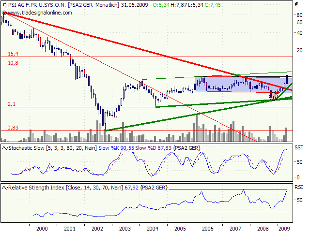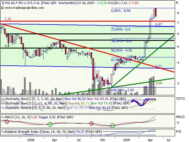 fundamental betrachtet sehe ich weiteres Aufwärtspotential, da wir 2004, 2006 und 2008 ähnliche Spitzenwerte schon mal hatten, bei deutlich schlechteren Zahlen und Aussichten der PSI. Mein Tip ist: es dauert nicht sehr lange, bis wir die 10 Euro-Marke überschreiten werden - keine 3 Monate mehr.