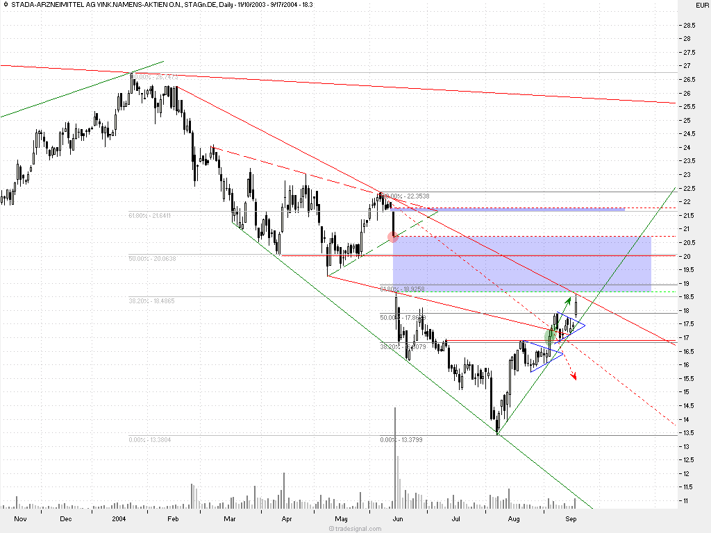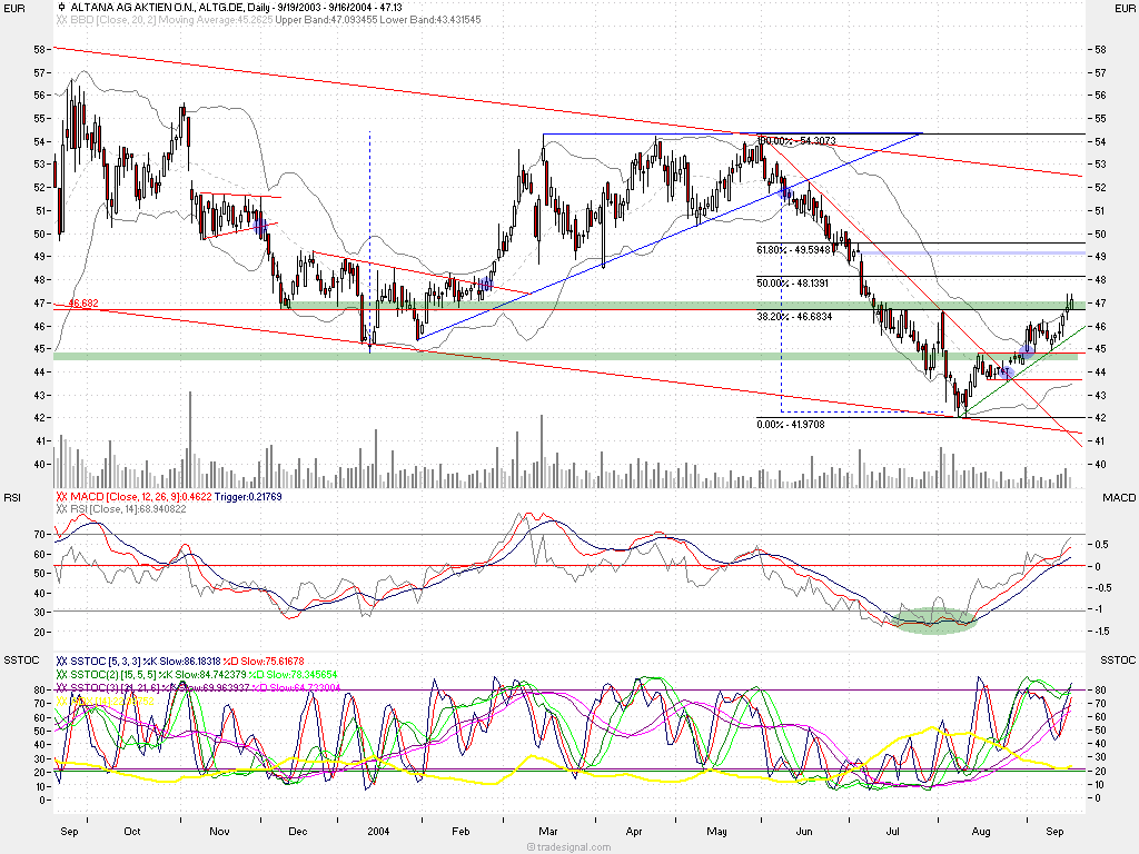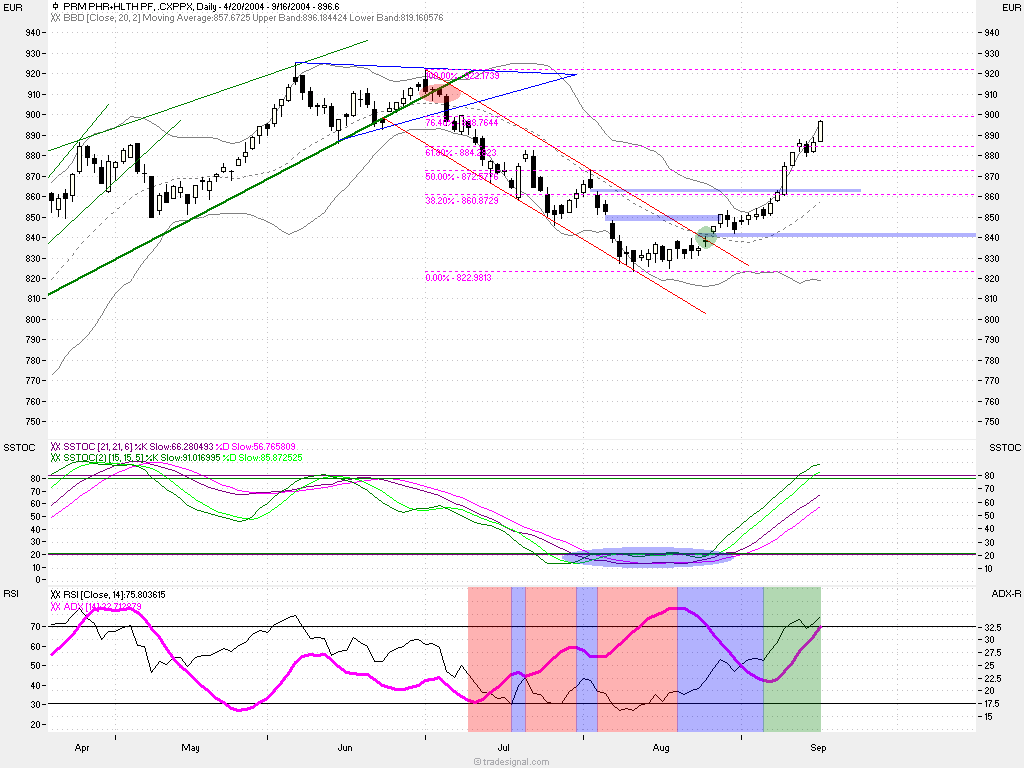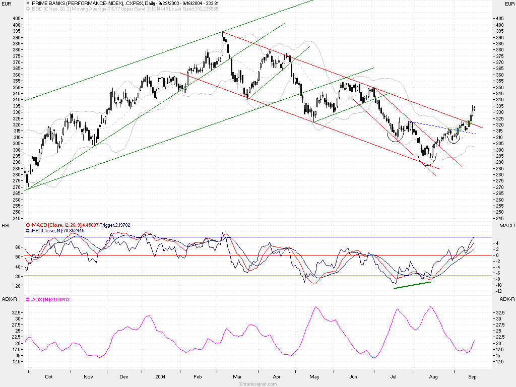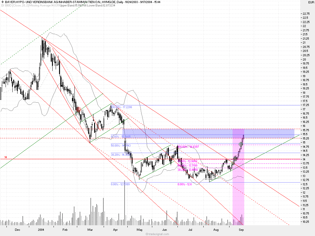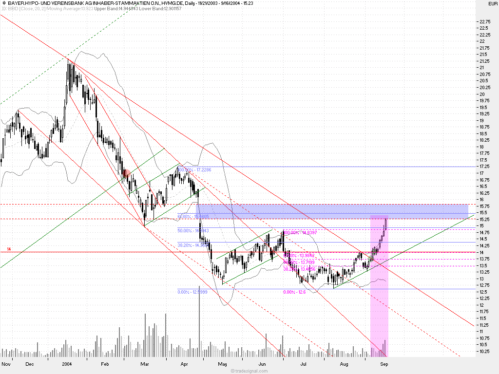 Teilverkauf der Position zu 0,29 (0,16) -> macht über 80% ;)) die aktie ist heute mit ihrem bisherign Hoch genau an das 62er retrace gelaufen.. wird auch noch diese marke gebrochen, so scheinen mir die 200tagelinie (15,70) bzw. das gapclosing (15,80) angesagt. man sollte allerdings bemerken dass die aktie nun schon seit 2 handelswochen über 16% gestiegen ist. HVB hat sich wunderbar am oberen bollingerband hochgezogen, und notiert heute sogar komplett überhalb dessen. die trenddynamik ist im deutlich steigendem adx sehr schön zu sehen.. die bankenwerte sind extrem gut gelaufen und ich möchte die position nicht überstrapazieren. hoffe natürlich insgeheim auf ein gapclosing.. dann wären hier die 100% voll.. great ;)