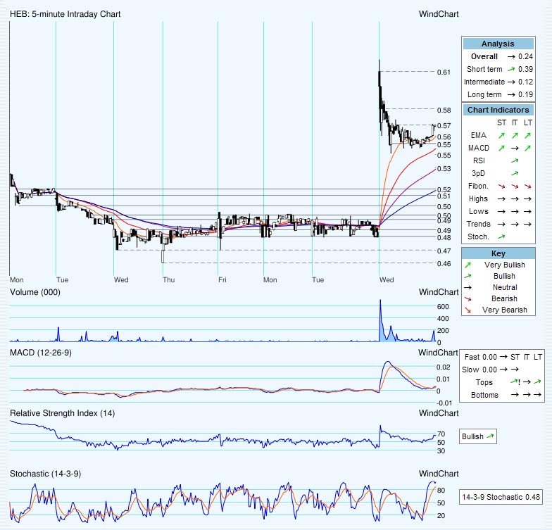 Shares of Hemispherx, which have lost 60 percent of their value since regulators declined to approve its treatment for chronic fatigue syndrome in December, were trading up 16 percent at 56 cents Wednesday on the American Stock Exchange.
