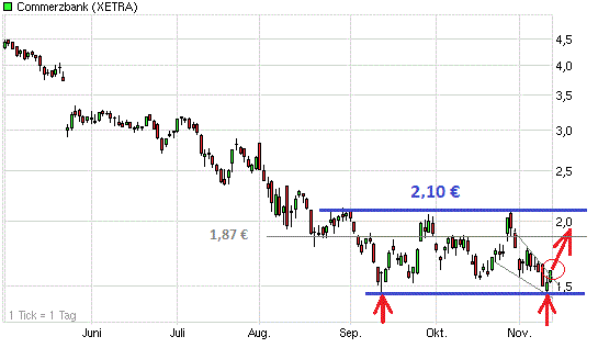 Fazit: Das Ausbleiben dramatisch schlechterer als die bisherigen Nachrichten vorausgesetzt, dürften die Serie immer neuer Tiefs bei 1,45 Euro ein Ende gefunden haben, d.h. dass wir wohl keine tieferen Kurse mehr sehen. Der Breakout aus der abschließenden Formation liefert das lange erwartete bullishe Signal, das den Kurs nun zurück an die Oberkante seines Seitwärtskanals bei 2,10 Euro führt. Bei 1,67 Euro ist mit einem kleinen Rücksetzer zu rechnen, der aber bullish-trendbestätigend wäre. |