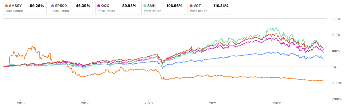 "Looking back even further, ams-OSRAM performed significantly worse than its main references, reporting a loss of -89.26% in the past 5 years, while all its references greatly outperformed the stock. The Vanguard Information Technology ETF is leading this comparison with over 110% performance, while even the VanEck Semiconductor ETF has achieved a return of 106% during the analyzed time, underscoring the significant relative weakness of ams-OSRAM's stock."