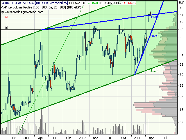 Rückblick: Die BIOTEST - Aktie startete nach einem Tief bei 2,79 Euro im März 2003 zu einer langfristigen Aufwärtsbewegung. Diese führte die Aktie bis April 2007 auf ein Hoch bei 33,49 Euro. Danach startete eine Seitwärtskonsolidierung, welche die Aktie Anfang Oktober 2007 nach oben auflöste. Bis 40,00 Euro kletterte die Aktie daraufhin. Von dort aus kam es zu einem minimal überschießenden Pullback. Am langfristigen Aufwärtstrend kam es wieder zu Käufen. Dieser liegt heute bei 32,40 Euro. In dieser Woche zieht die Aktie mit einer langen weißen Kerze über 33,49 Euro an, was sich aber bis zum morgigen Schlusskurs noch ändern könnte. Wenn die Kerze aber in ihrer Substanz bestehen bleibt, dann ist die Ausgangslage für die Aktie sehr gut.