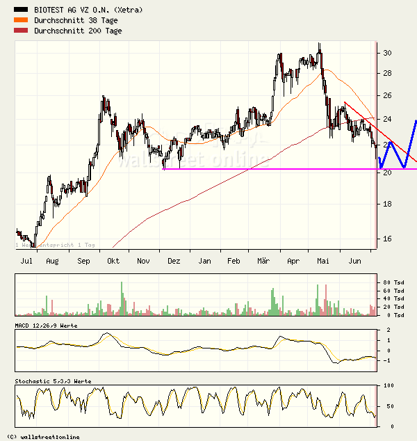 Ende Mai bestand die Chance, dass der Kurs genau an der 200TageLinie und dem labfristigen Trend nach oben dreht. Leider kam dann der schlechte Gesamtmarkt und die ausbleibenden News bei Biotest dazwischen. Dadurch war der ohnehin sehr steile Trend nicht zu halten. Ist daher kein Wunder, dass der Kurs derzeit fällt. Ich denke bei 21,0 € könnet eine erste Stabilisierung erfolgen, die mit guten halbjahreszahlen auch schnell wieder zu höheren Kursen führen kann. Es ist aber auch nicht auszuschließen, dass der Kurs sogar auf 18-19 € fällt, falls sich zu viele Anleger nur nach dem Chart richten.