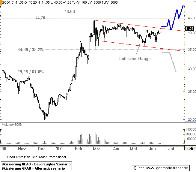 Rückblick: Die SOLON Aktie startete im Dezember 2006 zu einer steilen Rallye. Diese führte die Aktie von 19,94 auf 44,30 Euro. Damit erreichte die Aktie fast das Hoch aus dem Jahre 2000 bei 44,70 Euro. Seitdem konsolidiert die Aktie oberhalb des 38,2% Retracements bei 34,99 Euro in einer bullischen Flagge. Bei 41,50 Euro verläuft heute die obere Begrenzung dieser Flagge.