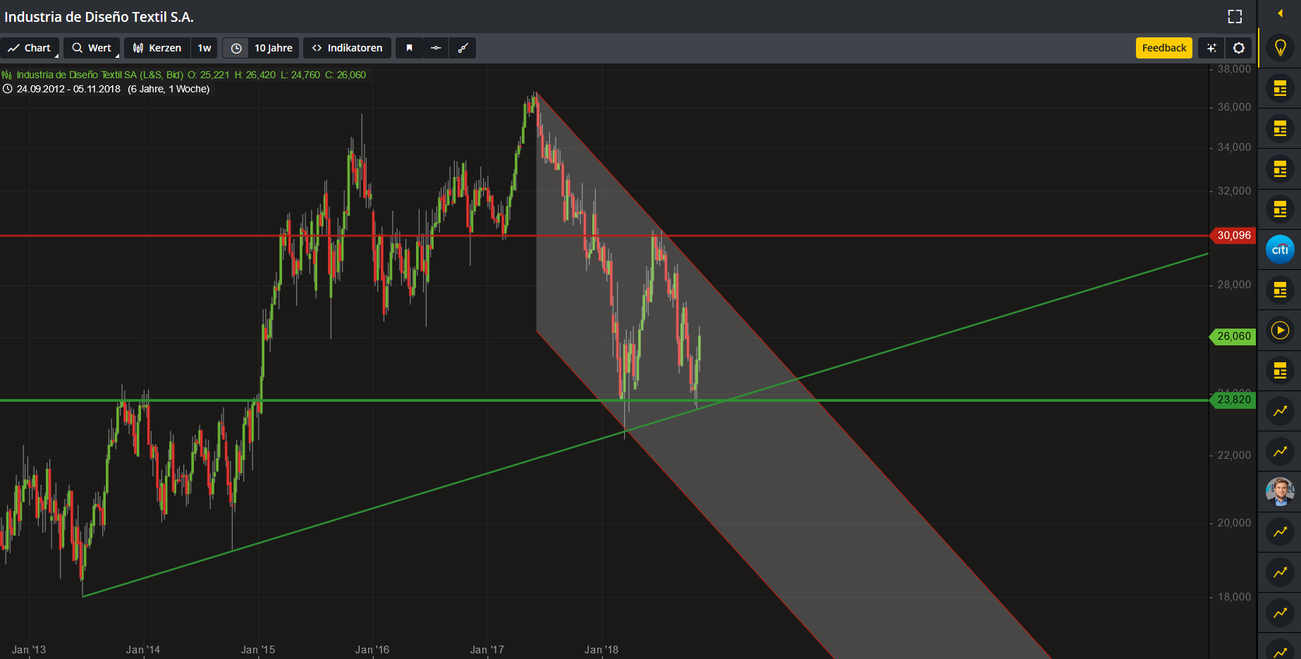 Mit einem Abschlag von sechs Prozent lag das Papier am späten Vormittag weit abgeschlagen am Ende des EuroStoxx 50 , den die Aktie im bisherigen Jahresverlauf aber deutlich überflügelt hatte. Während der europäische Leitindex seit dem Jahreswechsel gut neun Prozent zugelegt hat, kommt die Inditex-Aktie trotz der jüngsten Verluste immer noch auf ein Kursplus von 30 Prozent. Damit hängt Inditex auch den schwedischen Wettbewerber H&M klar ab, dessen Aktie gar sieben Prozent eingebüßt hat.