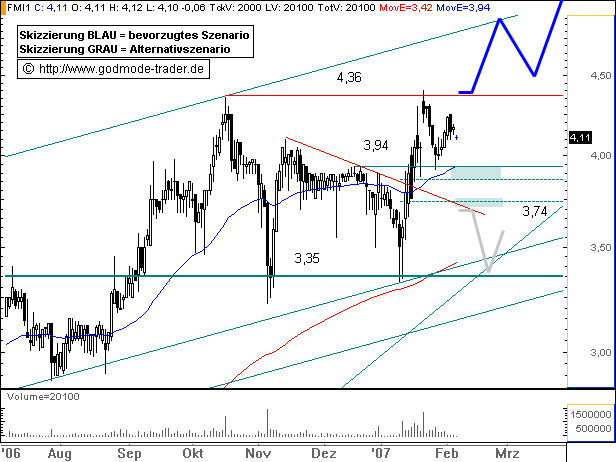 Aktueller Tageskerzenchart (log) seit 06.07.2006 (1 Kerze = 1 Tag) Rückblick: Die FORTUNE MANAGEMENT Aktie befindet sich seit dem Allzeittief bei 0,12 Euro im Juli 2003 in einer intakten Aufwärtsbewegung, wobei im Oktober 2006 ein Mehrjahreshoch bei 4,36 Euro markiert wurde. Dort startete eine Zwischenkorrektur, welche auf hohem Niveau oberhalb von 3,35 Euro verlief. Am 22.01.2007 erreichte sie erneut das Hoch bei 4,36 Euro und prallte daran nach unten hin ab. Das Chartbild ist weiterhin auf sämtlichen Zweitebenen bullisch zu werten. Die Aktie notiert oberhalb wichtiger Trendlinien und GDL. Charttechnischer Ausblick: Steigt sie jetzt per Tagesschluss über 4,36 Euro an, wird ein kurzfristiges Kaufsignal mit Ziel an der flach ansteigende Oberkante des Aufwärtstrends seit Mai 2006 (aktuell 4,80 Euro). Ein signifikanter Anstieg über die flach ansteigende Oberkante bei aktuell 4,80 Euro generiert ein mittelfristiges Kaufsignal mit ersten Zielen bei 8,30 und 11,00 Euro. Unter 3,70 Euro sollte die Aktie jetzt aber nicht mehr per Tagesschluss zurückfallen, um nochmals Abgaben bis 3,35 - 3,40 Euro zu verhindern. Ein größeres Verkaufsignal mit Zielen bei 2,60 und 2,06 - 2,34 Euro wird aber erst bei einem signifikanten Rückfall per Wochenschluss unter 3,10 Euro ausgelöst. ![]() |