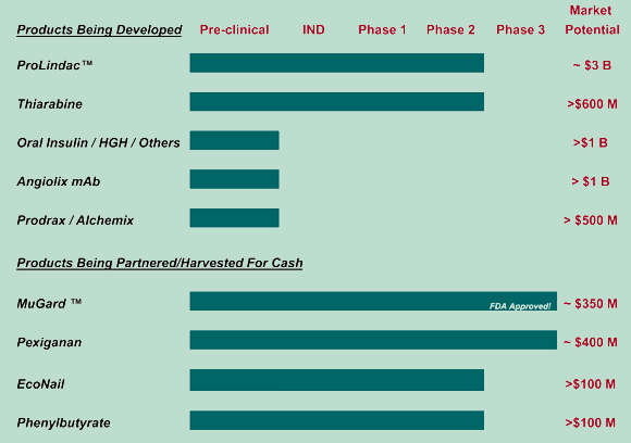Angiolix®, Alchemix®, and Prodrax® are anticancer products in preclinical development, while thiarabine is a novel nucleoside in phase 2 clinical development. Pexiganan is a phase 3 cream product for the treatment of diabetic foot ulcers and EcoNail is a phase 2 nail lacquer for treatment of onychomycosis.