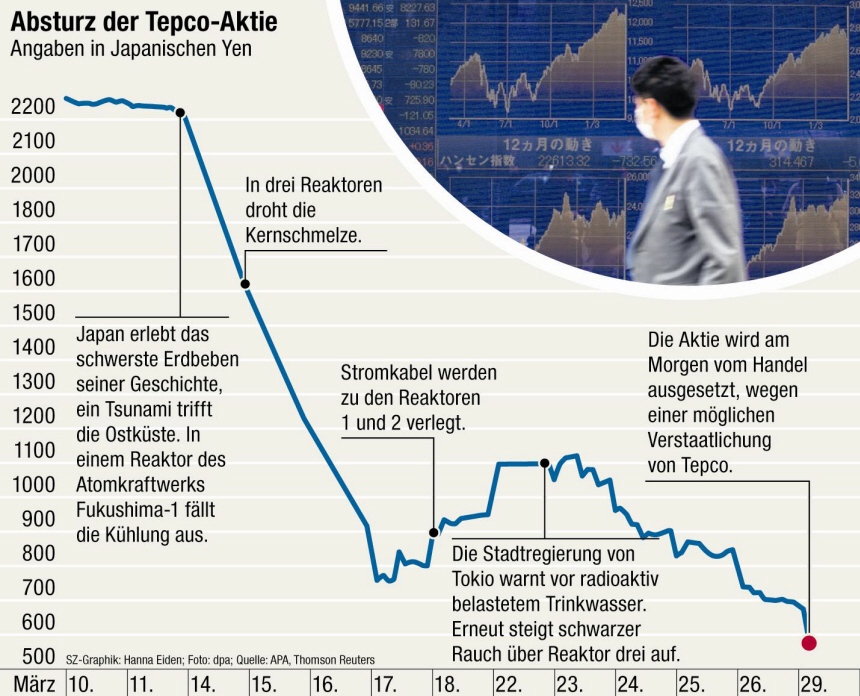 Während 381,9 Milliarden Yen in Zuschüssen von der Nuclear Damage Compensation und Stilllegungs-Facilitation Corporation als außerordentliche Einnahmen verbucht wurden, resultierte ein außerordentlicher Verlust von 286,8 Milliarden Yen aus Atomschaden-Kompensation und 21,3 Milliarden Yen aus ausserordentlichen Verlusten aus Katastrophen von 139,5% bis 318,0 Milliarden Yen im Nettoeinkommen, das den Eigentümern von Elternteil zuzuschreiben ist. Quelle: http://www.tepco.co.jp/en/press/corp-com/release/...487718_15409.html |
