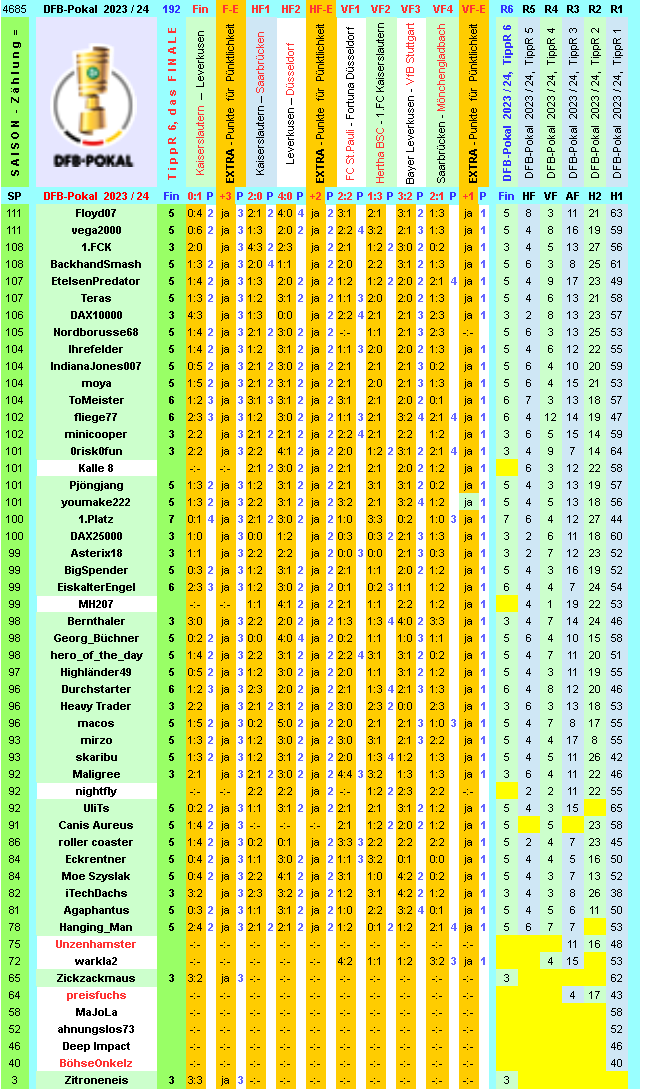 ... worden ist, hat der Fußball-Freund 1.Platz am besten performt, geile 7 Punkte abgeräumt; und SILBER ging an Durchstarter, EiskalterEngel, fliege77 und ToMeister für jeweils 6 Zähler; und BRONZE haben Agaphantus, BackhandSmash, BigSpender, Canis Aureus, Eckrentner, EtelsenPredator, Floyd07, Georg_Büchner, Hanging_Man, hero_of_the_day, Highländer49, Ihrefelder, IndianaJones007, macos, mirzo, Moe Szyslak, moya, Nordborusse68, Pjöngjang, roller coaster, skaribu, Teras, UliTs, vega2000, und youmake222 nach Hause gefahren, denen dafür jeweils 5 DFB-Thaler auf ihrem Pokal-Konto gutgebucht worden sind ... Der Spitzen-Truppe unseren herzlichen Glückwunsch ! ----------- Gold kauft den Wagen; Silber füttert die Pferde und füllt Dir den Tank ... |