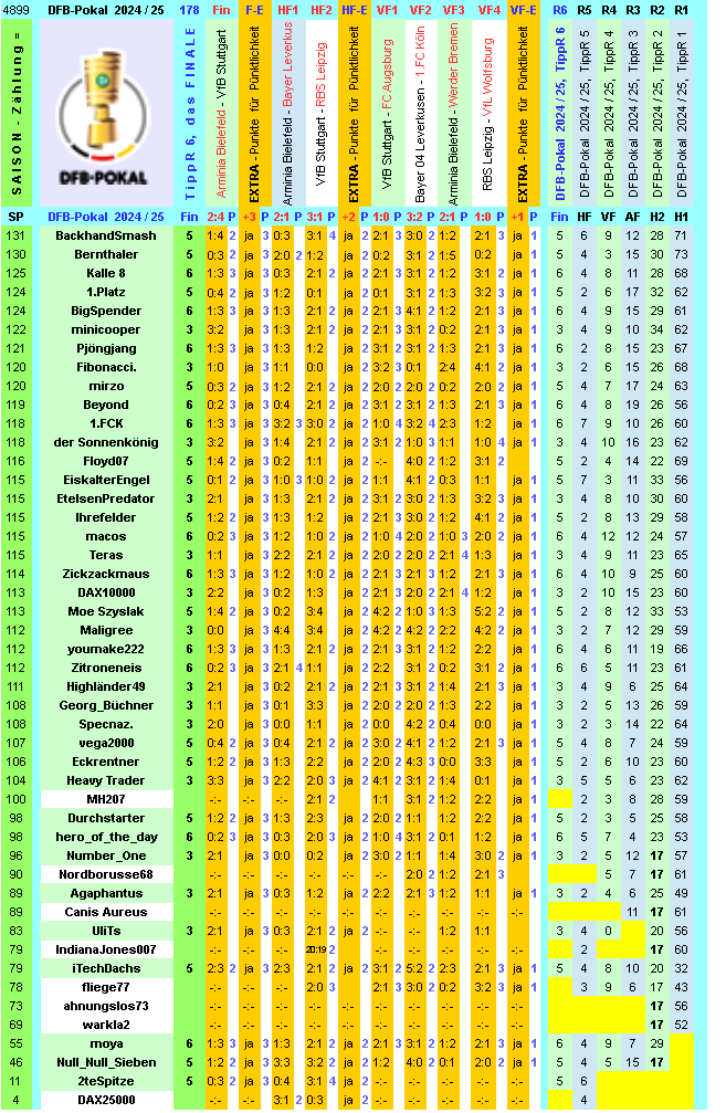 BackhandSmash auf Platz 1, der feiste 131 Punkte ins Ziel gebracht hat; dicht gefolgt von Bernthaler, mit stolzen 130 Punkten nur ganz knapp dahinter; und Kalle 8 vervollständigt das Treppchen, mit sehr guten 125 Punkten im Finish. Für etwaige Einwände gegen die durch einen System-Ausfall etwas erschwerten Auswertungen soll bis morgen (Mittwoch 28-May-2025) um 14:00 Uhr Zeit sein.