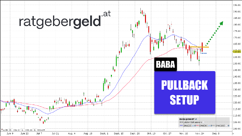 Die Alibaba-Aktie korrigierte nach einem starken Aufwärtstrend bis unter den EMA 50. Die Rückeroberung der gleitenden Durchschnitte in Form eines starken Impulses am heutigen Tag wurde wieder abverkauft.