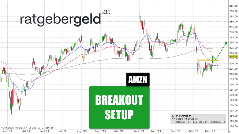 Amazon hat angekündigt, im Jahr 2026 rund 200 Milliarden USD in Infrastruktur zu investieren – primär für KI und Rechenzentren. Das hat Anleger kurzfristig verschreckt, da es den freien Cashflow belastet. Fundamental läuft es operativ sehr gut. Die Cloud-Sparte AWS wuchs zuletzt mit 24 % so schnell wie seit drei Jahren nicht mehr. Auch das Werbegeschäft liefert zweistellige Wachstumsraten. Gelingt die charttechnische Erholung, könnte die „Angstreaktion“ vom Februar schnell korrigiert werden. Wenn der Umsatz bei AWS entgegen den Investitionskosten nicht explodiert, droht eine Margenerosion.