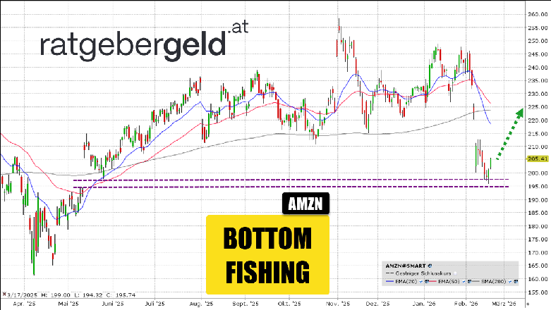 Der Kurs ist exakt in den Bereich zwischen 195 und 200 USD zurückgefallen. Dies ist eine Zone, die bereits im Frühjahr 2025 als Widerstand und später als Unterstützung fungierte. Das „Gedächtnis des Marktes“ scheint hier zu greifen. Mit zwei positiven Tagen deutet sich jetzt eine technische Gegenreaktion an, welche die Notierungen bis in den Bereich der 200-Tagelinie führen könnte.
