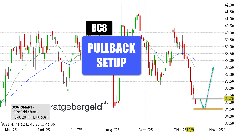 Bechtle-Aktie: Chart vom 14.10.2025, Kürzel: BC8 Kurs: 34.86 EUR, Tageschart Quelle: TWS