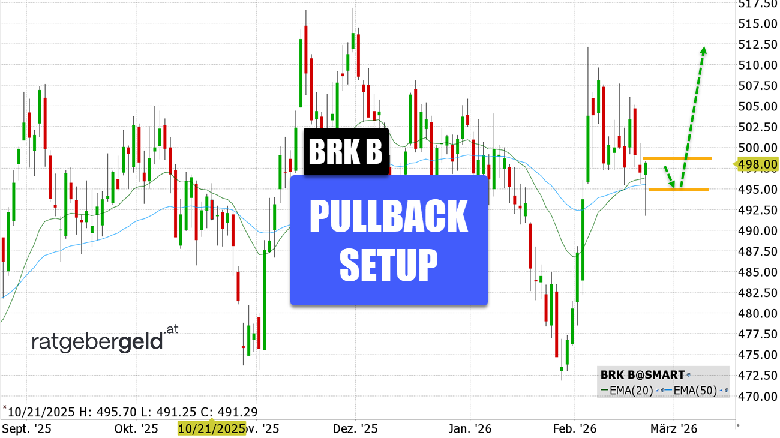 Rückblick: Zufall oder nicht – einen Tag bevor Warren Buffet über seinen Rücktritt als CEO informierte, erreichte die B-Aktie von Berkshire Hathway ihr Allzeithoch. Anschließend ging der Kursverlauf in eine Seitwärtsbewegung über. Nach der jüngsten Rückkehr auf die Oberseite der gleitenden Durchschnitte gab es ein Golden Cross sowie einen Rücksetzer mit dem Test der beiden EMAs in Form einer Hammerkerze. Der Schlusskurs über den beiden Linien ist ein klares Signal für die Bullen.
