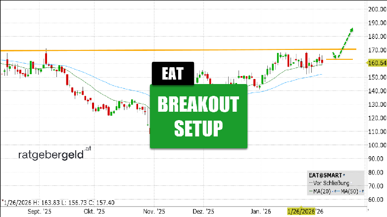 Brinker International betreibt mit Chili’s Grill & Bar und Maggiano’s Little Italy zwei in den USA gut bekannte Restaurantketten. In Anlegerkreisen gilt die Aktie teils als Turnaround-Wette, teils als Minenfeld. Positiv hervorgehoben werden die starke Markenbekanntheit, das vergleichsweise preisbewusste Angebot und die strategische Ausrichtung auf digitale Bestellungen und Take-away, womit Brinker auf verändertes Konsumverhalten reagiert. Gleichzeitig bleibt das Umfeld brutal: hohe Kosten, harter Wettbewerb und die notorisch dünnen Margen der Gastronomiebranche setzen das Geschäft unter Druck. Bei den letzten Quartalszahlen meldete überraschend gute Zahlen. Trotzdem trennte sich Kevin Hochman, der Vorstandsvorsitzende, am 29. Januar 2026 von 66.000 Stammaktien – ein Deal mit einem satten Gegenwert von rund 10,6 Millionen USD. Unterm Strich ist die Brinker-Aktie momentan bullisch, Trader sollten aber die Risiken kennen und absichern.