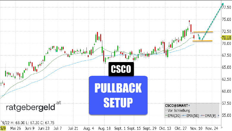 Die positiven Einschätzungen bauen darauf, dass Cisco veraltete Netzwerkausrüstung auf Vordermann bringen soll. Innovation sieht anders aus. Sobald Wettbewerber mit neueren Ansätzen vorbeiziehen, dürfte das Wertpapier Schwäche zeigen. Ein Stopp Loss knapp über 70 USD erscheint angebracht.