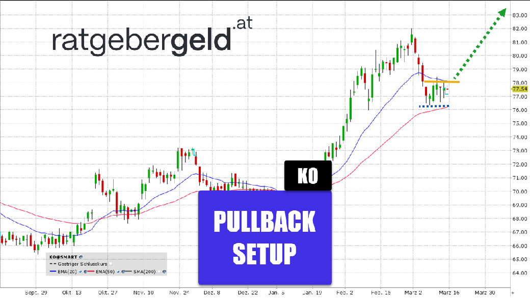 Die Aktie von Coca-Cola befindet sich in einem etablierten Aufwärtstrend, der Ende Januar/Anfang Februar massiv an Dynamik gewonnen hat. Nach einem Hoch bei 82 US-Dollar Ende Februar sehen wir eine gesunde Korrektur. Der Kurs ist exakt auf das Niveau des EMA 50 zurückgefallen.
