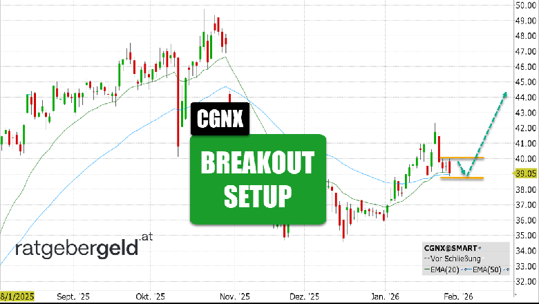 Rückblick: Nach den Q3-Zahlen war die Cognex-Aktie trotz guter fundamentaler Entwicklung unter die gleitenden Durchschnitte gerutscht, weil der Ausblick für Q4 und das Gesamtjahr eher durchwachsen waren. Sie kehrte aber in den ersten Januartagen auf die Oberseite zurück und konnte mit einem Golden Cross weiteres Anlegervertrauen zurückgewinnen. Die letzten drei Tageskerzen liegen eng an den beiden EMAs und bilden eine saubere Breakoutrange.