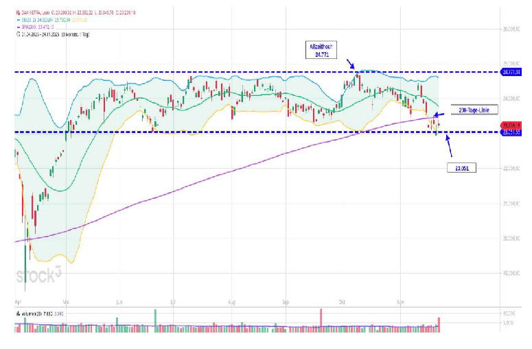 - Nächste wichtige charttechnische Unterstützungen: 23.051, 22.863, 22.765