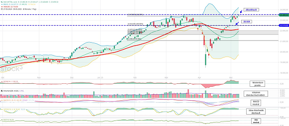 · Nächste charttechnische Widerstände: 23.543, 24.227 (Oberes Bollinger-Band)