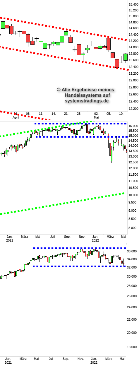 Auch heute gab es beim DOW den Kampf um den Trend. Der DAX dagegen ist davon nicht beeindruckt und bewegt sich weiter in seinem Trendkanal, der ihm viel Platz zum Austoben gibt. Charts: DAX-Tageschart, DAX-Wochenchart, DOW-Wochenchart.