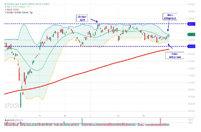 - Oberes Bollinger-Band: 23.922, Mittleres Bollinger-Band: 23.649, Unteres Bollinger-Band: 23.376