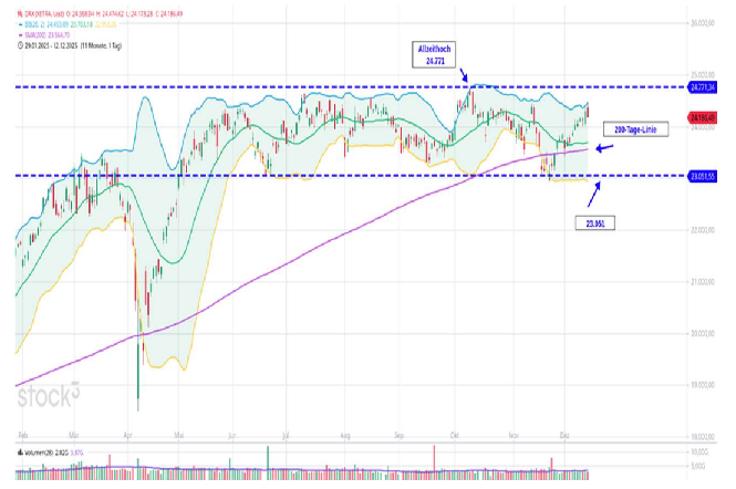 Technische Signale bleiben weiterhin der Kompass. Speziell die heutige Tagesentwicklung könnte für die aktuelle Aufwärtsbewegung wieder sehr richtungsweisend werden. Der deutsche Leitindex ist bis dato voll in der Jahresendrally angekommen. Am Freitag erfolgte zwar ein kleiner Dämpfer, der sich aber nicht negativ auswirken sollte. Die heutige Tagesbandbreite lässt sich daher wie folgt einordnen: 24.441 bis 24.008 Indexzähler. Der kleine Dämpfer vom Freitag ändert nichts am weiteren Drang nach oben. Auch die Kurzfristindikatoren zeigen keine akuten Verkaufssignale.